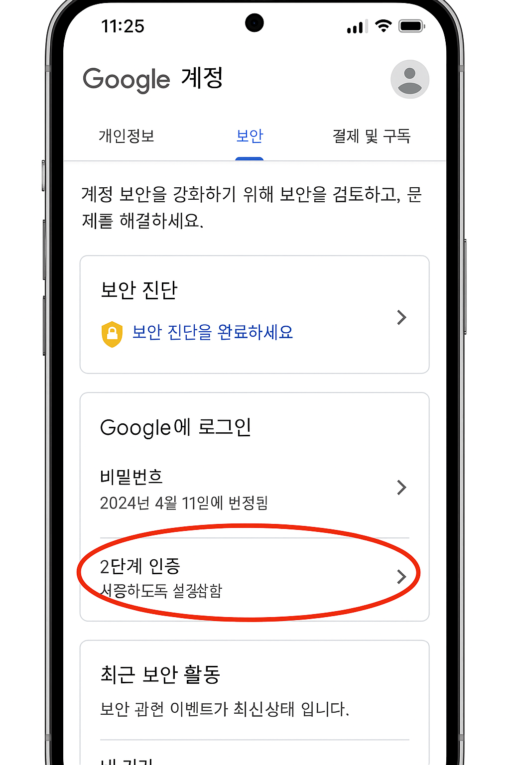• ‘Google에 로그인’ 항목 안에 **‘2단계 인증(2-Step Verification)’**이 보일 거예요. 눌러주세요.